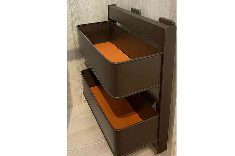 The side-mounted storage basket adopts a new design concept, all-magnesium aluminum alloy connection, replacing the plastic and metal connection, the structure is stronger and more durable; the appearance and tone are more consistent, fashionable and simple; the basket is made of high-grade leather and aluminum alloy, full of light luxury, three-section hidden guide rail, smooth and silent.
